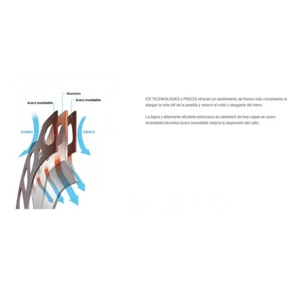 – ICE TECHNOLOGIES FREEZA, ICE TECHNOLOGIES, en combinación con la construcción del disco de freno FREEZA, disipa con rapidez el calor para obtener un rendimiento de frenos más consistente en condiciones extremas, alargar la vida útil de la pastilla y reducir el ruido y desgaste del freno.